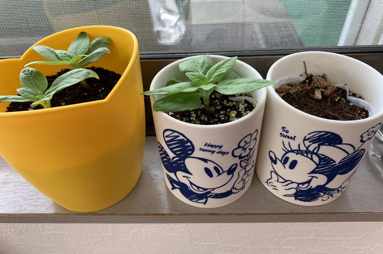日当たりの良い🌞店舗の窓際に、向日葵🌻とワイルドストロベリー🍓の種を蒔いて約3週間❣